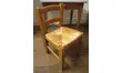 Chaise avec assise en paille et reprise du rouge sur l'arrière du dossier.Petite plaque ronde avec le chiffre 4.