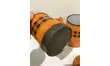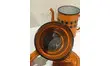 Parfaite en décoration ou à détourner en vase, ancienne et grande cafetière en émail orange à carreaux noirs .
