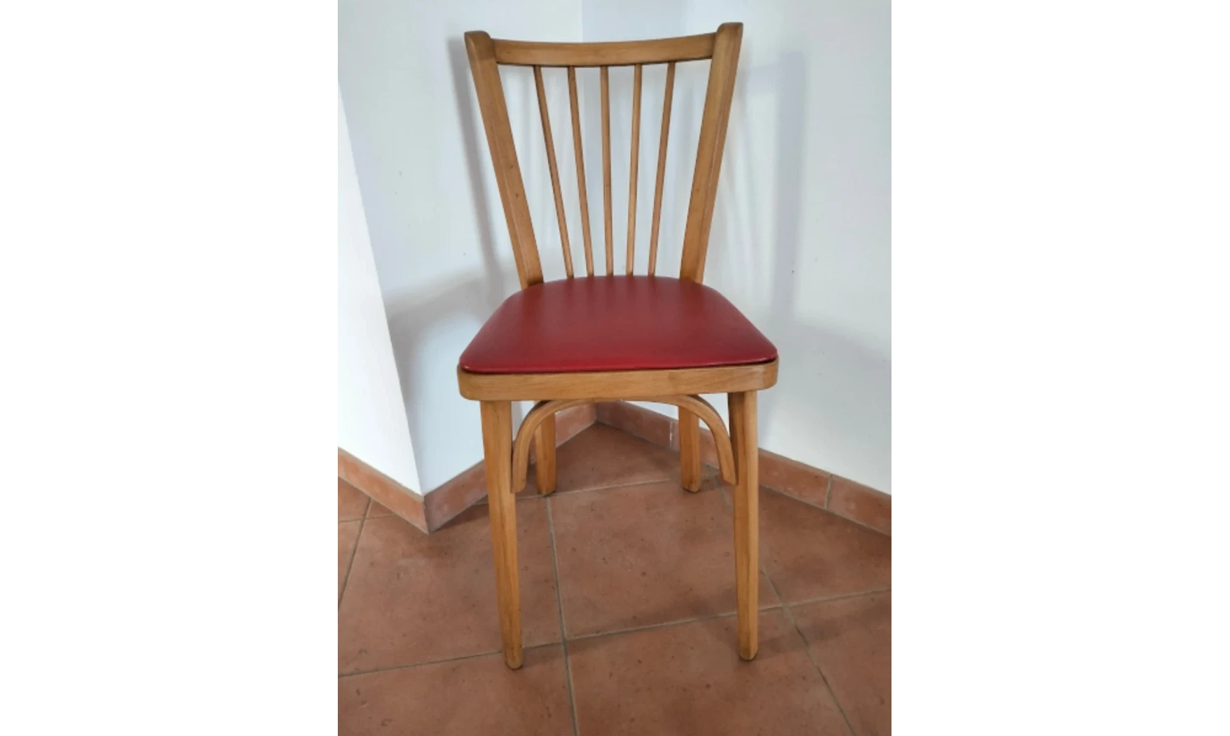 Chaise Baumann en hêtre avec assise en simili cuir rouge.