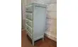 Chiffonnier des années 50 en bois, décapé et peint en vert/bleu eucalyptus. Intérieur des tiroirs peint en jaune et papier à rayures dans le fond. Poignées d'origine.