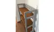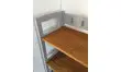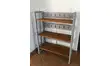 Etagère de bouquiniste vintage, décapée et peinte en gris clair. Les trois plateaux sont teintés et vernis chêne moyen.